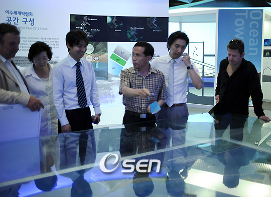 한국을 방문 중인 세계적인 건축가 윌리엄 알솝과 유명 조각가 노버트 브루너가 15일 여수 일정 이틀째를 맞아 여수시와 전남도가 추진하고 있는 개발지를 둘러 보며 참고 자료를 수집하는 등 투자 적정성 판단에 들어갔다. 2012년 세계박람회를 유치한 여수는 동북아 최고의 해양관광도시를 꿈꾸며 국내외 투자자들에게 러브콜을 보내고 있다. 여수가 가진 천혜의 자원과 세계박람회 개최도시라는 호재를 앞두고 여수를 바라보는 투자자들의 관심도 어느 때 보다 높다. 특히 여수시와 전남도가 추진하고 있는 경도 해양관광단지 조성사업은 214만 평방미터 규모의 경도라는 섬 전체를 테마관광단지로 개발하는 계획으로 1단계 사업비만 3200억 원이 넘게 들어가는 대규모 사업이다. 여수시에서는 세계 무대에 내놓아도 손색없는 골프장을 중심으로 밑그림을 그리고는 있지만 여타 골프장과 차별화해 기획단계에서부터 ‘친환경’을 주창하고 있다. 알솝이 견지하고 있는 건축의 특징도 ‘환경과 예술’이다. 주변과 조화하지 않는 건축은 죄악으로 여기는 게 알솝과 브루너의 건축 철학이다. 건축이 갖고 있는 예술적 요소를 실제 건축에 적극 반영함으로써 건축과 예술의 영역을 아우르는 작품세계로 유명한 알솝과 브루너는 건축회사인 독일 NOA2를 공동 설립해 운영하고 있다. 여수세계박람회 홍보관을 찾은 알솝 일행에게 김두인 여수시 경제투자유치담당관(가운데)이 엑스포 단지를 설명하고 있다. /여수=강희수 기자 100c@osen.co.kr