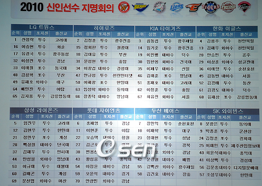 2010 프로야구 신인 지명회의가 각 구단 관계자들이 참석한 가운데 17일 오후 서울 서초구 양재동 교육문화회관에서 열렸다. 이번 신인지명회의는 지역연고에 관계없이 실시하며 홀수 라운드는 전년도 성적의 역순, 짝수라운드는 전년도 성적순(SK, 두산, 롯데, 삼성, 한화, KIA, 히어로즈, LG)으로 각 구단이 1명씩 지명하는 방식으로 최종 10라운드까지 진행된다. 각 구단의 지명 선수들 명단./윤민호 기자ymh@osen.co.kr