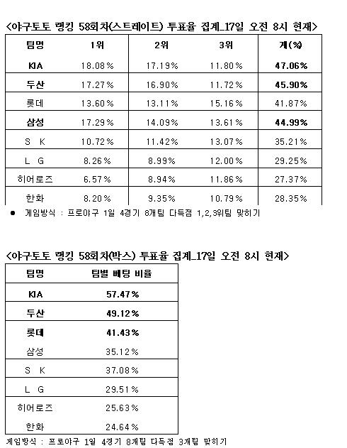 [야구토토] 야구팬들은 18일에 열리는 야구토토 랭킹 58회차 게임 대상 8개팀 가운데 KIA, 두산, 삼성의 다득점을 예상하고 있는 것으로 나타났다. 스포츠토토 공식발매 사이트인 베트맨(www.betman.co.kr)은 18일(화)에 개최되는 두산-LG, 한화-삼성, KIA-히어로즈, 롯데-SK전 등 4경기 8개팀을 대상으로 한 야구토토 랭킹 58회차 스트레이트 게임 중간집계결과 KIA(47.06%), 두산(45.90%), 삼성(44.99%)를 다득점 상위 3개팀으로 꼽았다고 밝혔다. 반면 히어로즈와 한화는 각각 27.37%와 28.35%를 득표해 다득점 가능성이 가장 낮은 것으로 나타났다. 순위에 상관없이 다득점 3개팀만을 맞히는 ‘박스’ 게임 역시 KIA(57.47%)가 최다득표를 기록한 가운데, 두산(49.12%), 롯데(41.43%)가 뒤를 이었다. 반면 한화(24.64%)와 히어로즈(25.63%)는 리그 8개 팀 중 가장 적은 득점을 기록할 것으로 내다봤다. 베트맨 관계자는 “국내 야구팬들은 주중 프로야구 경기를 대상으로 발행하는 야구토토 랭킹 게임에서 KIA가 8개 팀 중 가장 많은 득점을 기록할 것으로 전망했다” 며 “특히 KIA의 경우 최근 가파른 상승세를 타고 있는데다 최희섭, 김상현 등 타격이 폭발하고 있기 때문에 다득점 가능성이 가장 높은 팀으로 떠오르고 있다” 고 밝혔다. 한편, 야구토토 랭킹 58회차 게임은 경기 시작 10분전인 18일 오후 6시 20분에 발매가 마감되며, 경기가 모두 종료된 후 적중결과가 공식 발표된다. 이어지는 야구토토 랭킹 59회차 게임은 19일(수)에 벌어지는 두산-LG, 한화-삼성, KIA-히어로즈, 롯데-SK전을 대상으로 하며 경기 시작 10분전인 19일 오후 6시20분에 발매가 마감된다. http://www.betman.co.kr">'즐거운 스포츠, 즐거운 토토'(http://www.betman.co.kr).
