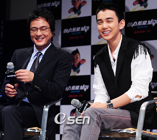 애니메이션 '아스트로보이-아톰의 귀환' 런칭로드쇼가 18일 오전 서울 압구정CGV에서 열렸다. 이 자리에는 영화의 더빙을 맡은 유승호 조민기 남지현 유세윤이 참석했다. 오는 11월에 개봉 예정인 이 영화는 50여 년간 꾸준한 사랑을 받으며 전세계 문화 아이콘으로 자리매김한 '아톰'이 3D 애니메이션 극영화로 재탄생해 개봉 전 부터 큰 화제를 낳고 있다. 기자회견중 조민기와 유승호가 환하게 미소짓고 있다./민경훈 기자 rumi@osen.co.kr