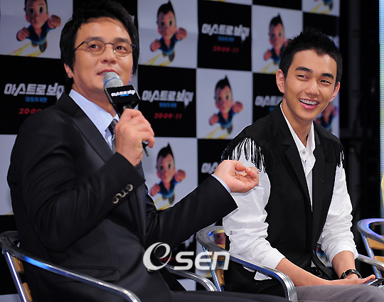 애니메이션 '아스트로보이-아톰의 귀환' 런칭로드쇼가 18일 오전 서울 압구정CGV에서 열렸다. 이 자리에는 영화의 더빙을 맡은 유승호 조민기 남지현 유세윤이 참석했다. 오는 11월에 개봉 예정인 이 영화는 50여 년간 꾸준한 사랑을 받으며 전세계 문화 아이콘으로 자리매김한 '아톰'이 3D 애니메이션 극영화로 재탄생해 개봉 전 부터 큰 화제를 낳고 있다. 기자회견 중 조민기의 말에 유승호가 미소짓고 있다./민경훈 기자 rumi@osen.co.kr