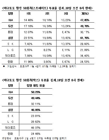 [야구토토] 야구팬들은 19일에 열리는 야구토토 랭킹 59회차 게임 대상 8개팀 가운데 삼성, 두산, KIA의 다득점을 예상하고 있는 것으로 나타났다. 스포츠토토 공식발매 사이트인 베트맨(www.betman.co.kr)은 19일(수)에 개최되는 두산-LG, 한화-삼성, KIA-히어로즈, 롯데-SK전 등 4경기 8개팀을 대상으로 한 야구토토 랭킹 59회차 스트레이트 게임 중간집계결과 삼성(61.76%), 두산(49.78%), KIA(47.85%)를 다득점 상위 3개팀으로 꼽았다고 밝혔다. 반면 LG와 한화는 각각 21.89%와 24.53%를 득표해 다득점 가능성이 가장 낮은 것으로 나타났다. 순위에 상관없이 다득점 3개팀만을 맞히는 ‘박스’ 게임에서는 KIA(50.29%)가 최다득표를 기록한 가운데, 두산(49.44%), 삼성(46.89%)가 뒤를 이었다. 반면 SK(23.81%)와 한화(24.46%)는 리그 8개 팀 중 가장 적은 득점을 기록할 것으로 내다봤다. 베트맨 관계자는 “국내 야구팬들은 주중 프로야구 경기를 대상으로 발행하는 야구토토 랭킹 게임에서 스트레이트와 박스게임 모두 삼성, 두산, KIA 세 팀이 다득점을 기록할 것으로 내다봤다” 며 “과연 삼성, 두산, KIA가 주중 3연전에서 상승세를 이어갈 수 있을지 야구팬들의 관심이 집중되고 있다” 고 밝혔다. 한편, 야구토토 랭킹 59회차 게임은 경기 시작 10분전인 19일 오후 6시 20분에 발매가 마감되며, 경기가 모두 종료된 후 적중결과가 공식 발표된다. 이어지는 야구토토 랭킹 60회차 게임은 20일(목)에 벌어지는 두산-LG, 한화-삼성, KIA-히어로즈, 롯데-SK전을 대상으로 하며 경기 시작 10분전인 20일 오후 6시20분에 발매가 마감된다. http://www.betman.co.kr">'즐거운 스포츠, 즐거운 토토'(http://www.betman.co.kr).