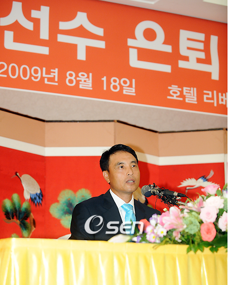 '기록의 사나이' 송진우(43, 한화)가 18일 오후 대전 유성구 봉명동 리베라호텔에서 은퇴 기자회견을 가졌다. 세광고-동국대를 거쳐 지난 1989년 빙그레(한화 전신) 유니폼을 입은 송진우는 개인 통산 200승(2006년 8월 29일 광주 KIA전), 2000탈삼진(2008년 6월 6일 대전 히어로즈전), 3000이닝 투구(2009년 4월 대전 두산전) 등 불멸의 기록을 수립한 바 있다. 송진우가 은퇴기자회견을 갖고 있다./대전=윤민호 기자ymh@osen.co.kr