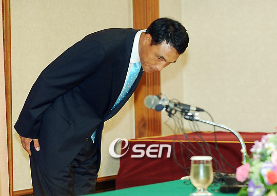 '기록의 사나이' 송진우(43, 한화)가 18일 오후 대전 유성구 봉명동 리베라호텔에서 은퇴 기자회견을 가졌다. 세광고-동국대를 거쳐 지난 1989년 빙그레(한화 전신) 유니폼을 입은 송진우는 개인 통산 200승(2006년 8월 29일 광주 KIA전), 2000탈삼진(2008년 6월 6일 대전 히어로즈전), 3000이닝 투구(2009년 4월 대전 두산전) 등 불멸의 기록을 수립한 바 있다. 은퇴 기자회견에 참석한 송진우가 인사를 하고 있다./대전=윤민호 기자ymh@osen.co.kr