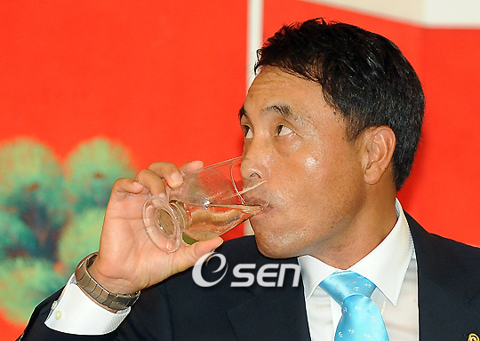 '기록의 사나이' 송진우(43, 한화)가 18일 오후 대전 유성구 봉명동 리베라호텔에서 은퇴 기자회견을 가졌다. 세광고-동국대를 거쳐 지난 1989년 빙그레(한화 전신) 유니폼을 입은 송진우는 개인 통산 200승(2006년 8월 29일 광주 KIA전), 2000탈삼진(2008년 6월 6일 대전 히어로즈전), 3000이닝 투구(2009년 4월 대전 두산전) 등 불멸의 기록을 수립한 바 있다. 은퇴 기자회견을 갖던 송진우가 물을 마시고 있다./대전=윤민호 기자ymh@osen.co.kr
