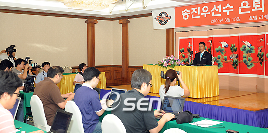 '기록의 사나이' 송진우(43, 한화)가 18일 오후 대전 유성구 봉명동 리베라호텔에서 은퇴 기자회견을 가졌다. 세광고-동국대를 거쳐 지난 1989년 빙그레(한화 전신) 유니폼을 입은 송진우는 개인 통산 200승(2006년 8월 29일 광주 KIA전), 2000탈삼진(2008년 6월 6일 대전 히어로즈전), 3000이닝 투구(2009년 4월 대전 두산전) 등 불멸의 기록을 수립한 바 있다. 송진우가 기자회견을 갖고 있다./대전=윤민호 기자ymh@osen.co.kr