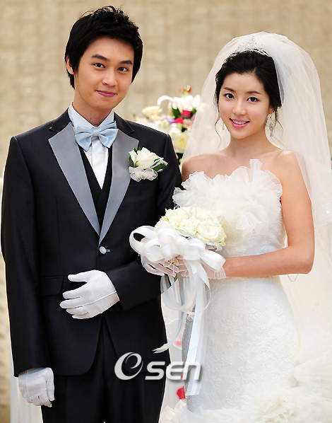 KBS 1TV 일일드라마 '다함께 차차차'(유윤경 김정은 극본, 김성은 김영균 연출)의 박한별(한진경 역)-이중문(이한 역)의 결혼식 장면 촬영현장을 19일 오전 서울 영등포구 당산동 '문화웨딩홀'에서 공개했다. 이 드라마는 피 한 방울 섞이지 않은 두 여자가 '가족'으로 살아가는 모습을 통해 진정한 가족애가 무엇인지를 돌아보게 내용을 담고 있다. 이중문과 박한별이 결혼식장에서 포즈를 취하고 있다./민경훈 기자 rumi@osen.co.kr