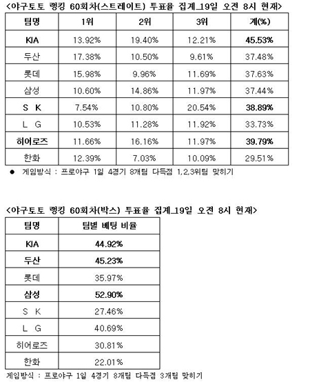 [야구토토] 야구팬들은 20일에 열리는 야구토토 랭킹 60회차 게임 대상 8개팀 가운데 KIA, 히어로즈, SK의 다득점을 예상하고 있는 것으로 나타났다. 스포츠토토 공식발매 사이트인 베트맨(www.betman.co.kr)은 오는 20일에 개최되는 두산-LG, 한화-삼성, KIA-히어로즈, 롯데-SK전 등 4경기 8개팀을 대상으로 한 야구토토 랭킹 60회차 스트레이트 게임 중간집계결과 KIA(45.53%), 히어로즈(39.79%), SK(38.89%)를 다득점 상위 3개팀으로 꼽았다고 밝혔다. 반면 LG와 한화는 각각 33.73%와 29.51%를 득표해 다득점 가능성이 가장 낮은 것으로 나타났다. 순위에 상관없이 다득점 3개팀만을 맞히는 ‘박스’ 게임에서는 삼성(52.90%)이 최다득표를 기록한 가운데, 두산(45.23%), KIA(44.92%)가 뒤를 이었다. 반면 SK(27.46%)와 한화(22.01%)는 리그 8개 팀 중 가장 적은 득점을 기록할 것으로 내다봤다. 베트맨 관계자는 "국내 야구팬들은 주중 프로야구 경기를 대상으로 발행하는 야구토토 랭킹 게임에서 리그 선두 굳히기에 들어간 KIA의 최다득점을 예상했다"며 "팀 득점평균에서는 하위권을 달리고 있지만 최근 놀라운 뒷심과 장타력을 보이고 있는 KIA가 다득점에 성공할 수 있을지 야구팬들의 관심이 집중되고 있다"고 밝혔다. 한편 야구토토 랭킹 60회차 게임은 경기 시작 10분 전인 20일 오후 6시 20분에 발매가 마감되며, 경기가 모두 종료된 후 적중결과가 공식 발표된다. '즐거운 스포츠, 즐거운 토토'(http://www.betman.co.kr)