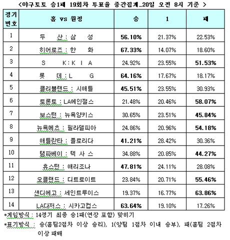 [야구토토] 야구토토 승1패 19회차 투표율 중간 집계 결과…KIA, SK에 우세 전망 보스턴-뉴욕 양키스전, 양키스 승리 예상…21일 18시 20분 발매마감 국내 야구팬들은 국내프로야구 SK 와이번스-KIA 타이거즈전에서 KIA의 우세를 전망했다. 스포츠토토 온라인 발매사이트인 베트맨(www.betman.co.kr)은 오는 21일부터 22일(이하 한국시간)까지 벌어지는 국내프로야구 4경기, 미국프로야구(MLB) 10경기 등 총 14경기를 대상으로 한 야구토토 승1패 19회차 투표율 중간집계 결과 전체 참가자의 절반이 넘는 51.53%가 KIA가 SK에 우세한 경기를 펼칠 것으로 전망했다고 밝혔다. SK의 승리에 투표한 참가자는 24.92%에 머물렀고, 나머지 23.55%는 양팀의 1점차 박빙승부를 전망했다. 이밖에 국내 프로야구에서는 두산(56.10%)과 히어로즈(67.33%), 롯데(64.16%)가 각각 삼성(22.53%), 한화(18.60%), LG(18.17%)를 상대로 우세한 경기를 펼칠 것이라는 예상이 다수를 차지했다. 양키스, 보스턴에 승리 거둘 것 아메리칸리그 전통의 라이벌 보스턴-뉴욕 양키스전(7경기)이 벌어지는 MLB에서는 원정팀 뉴욕양키스(45.84%)가 보스턴(30.65%)을 누르고 승리를 챙길 것으로 내다봤다. 추신수가 연일 맹활약하고 있는 클리블랜드(45.51%)는 시애틀(30.93%)에 우세한 경기를 펼칠 것으로 예상했다. 또 아메리칸리그에서 좋은 성적을 거두고 있는 LA 에인절스(58.07%)을 비롯해 텍사스(44.27%), 디트로이트(55.46%)는 원정의 불리함을 딛고 승수 챙기기에 성공할 것이라는 전망이 많았다. 박찬호가 불펜에서 호투하고 있는 내셔날리그의 강자 필라델피아(54.18%)와 리그 선두 LA다저스(63.64%)는 각각 뉴욕 메츠(24.86%)와 시카고 컵스(17.26%)를 누르고 선두권 유지에 성공할 것으로 예상했다. 이밖에 내셔날리그에서는 많은 야구팬들이 애틀란타(41.21%)와 휴스턴(47.81%), 세인트루이스(63.86%)의 우세에 투표했다. 한편 이번 야구토토 승1패 19회차 게임은 첫번째 경기 시작 10분전인 21일 오후 6시20분에 발매를 마감하며 모든 경기가 종료된 후 결과를 공식 발표한다. '즐거운 스포츠, 즐거운 토토'(http://www.betman.co.kr)