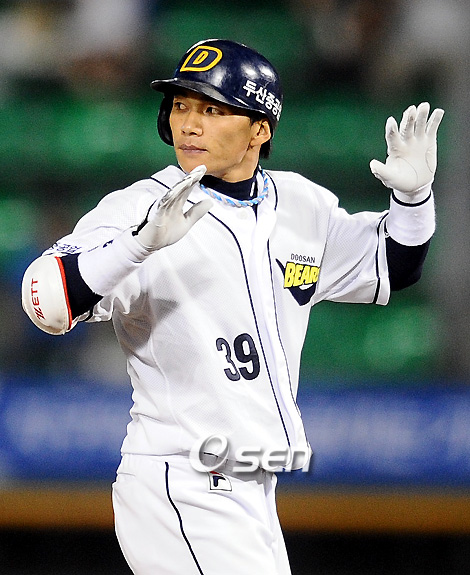 "개인 성적에는 큰 목표 없어요. 팀 승리에 보탬이 되야죠". '종박' 이종욱(29. 두산 베어스)이 다시 타격감을 되찾았다. 이종욱은 20일 잠실 LG전에 2번 타자 겸 중견수로 선발 출장, 5타수 3안타 2타점을 올리며 팀의 12-3 대승에 공헌했다. 특히 이종욱의 1경기 3안타는 지난 5월 31일 대전 한화 전 이후 81일 만이다. 턱관절 골절상서 빠르게 복귀했으나 타격감 회복에 어려움을 겪었던 이종욱인 만큼 이날 3안타 활약은 의미가 있었다. 경기 후 이종욱은 "1경기 3안타에는 의미를 갖지 않는다. 팀이 3연패에서 벗어났다는 것이 중요하다"라고 이야기했다. 상대 선발 한희(20)에게 같은 구종에 유사한 코스에서 투수를 스치는 중전 안타를 때린 데 대해 "변화구가 많은 것 같아 히팅 포인트를 뒤 쪽에 두고 공략한 것이 맞아 떨어졌다"라고 밝혔다. 뒤이어 그는 헤드 퍼스트 슬라이딩을 자제하는 데 대해 묻자 웃으며 "아직 악관절이 완전히 아물지 않은 상황이다. 그에 대해 신경 쓰면서 다리부터 들어가는 슬라이딩을 하고 있다"라고 답햇다. "개인 성적, 타율 등이 올라가는 것은 중요하지 않다. 팀이 상승세를 타는 것이 우선"이라며 주축 선수의 책임감을 이야기한 이종욱은 앞으로 삼성, KIA 등 어려운 상대와 맞대결하게 된 데 대해 "선수들에 특별히 이야기는 하지 않았다. 잘하는 팀과 재미있는 경기가 될 것 같아 선수들이 체력 안배를 잘하며 경기력을 높였으면 한다"라는 바람을 밝혔다. farinelli@osen.co.kr '2009 CJ 마구마구 프로야구' 두산 베어스와 LG 트윈스 경기가 20일 잠실 경기장에서 열렸다. 5회말 2사 2루 이종욱 동점 1타점 2루타를 날리며 2루에서 타임을 요청하고 있다./잠실=김영민 기자ajyoung@osen.co.kr