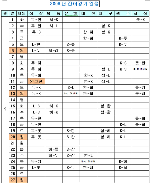 한국야구위원회(KBO)는 우천으로 취소된 33경기와 잔여 32경기를 합한 총 65경기의 잔여경기 일정을 확정해 발표했다. 잔여경기 일정은 9월 1일부터 25일까지 총 25일간 진행되며 시즌 최종일인 25일에 8팀이 동시에 종료되도록 편성했다. 이번에 발표된 경기가 우천으로 순연되면 예비일이 있을 경우는 예비일에, 그리고 추후편성 순으로 진행한다. 더블헤더와 월요일 경기는 거행하지 않는다. 단 동일대진 경기가 2경기 이상 연기되면 9월 25일 이후에 편성되는 경기는 필요에 따라 월요일경기와 더블헤더를 실시할 수 있도록 했다. 한편 더블헤더 제 1경기는 연장전 없이 9회까지만 거행한다. letmeout@osen.co.kr
