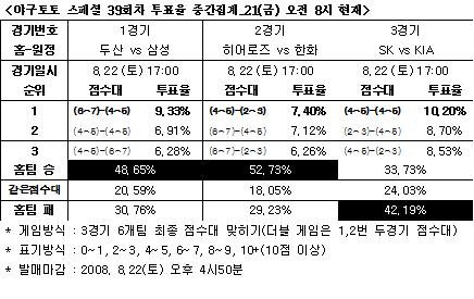 [야구토토] 대다수 국내 야구팬들은 오는 22일(토) 오후에 벌어지는 2009시즌 국내프로야구 두산베어스-삼성라이온스전에서 두산의 승리를 전망했다. 스포츠토토 공식 온라인 발매 사이트인 베트맨(www.betman.co.kr)은 오는 22일 오후에 펼쳐지는 두산베어스-삼성라이온스, 히어로즈-한화이글스, SK와이번스-KIA타이거즈전 등 국내 프로야구 3경기를 대상으로 한 야구토토 스페셜 39회차 투표율 중간집계 결과 전체 참가자의 절반에 가까운 48.65%가 두산이 삼성을 누르고 선두 경쟁에 불을 지필 것으로 전망했다고 밝혔다. 30.76%는 삼성의 승리를 내다봤고, 나머지 20.59%는 양팀이 같은 점수대를 기록할 것으로 예상했다. 최종 점수대로는 6~7점-4~5점으로 두산 승리(9.33%)가 가장 많았고, 4~5점-4~5점 같은 점수대(6.91%), 4~5점-6~7점 삼성 승리(6.28%)가 뒤를 이었다. 2경기 히어로즈-한화전은 참가자의 52.73%가 홈팀 히어로즈의 승리를 예상했고, 29.23%는 원정팀 한화의 우세에 투표했다. 같은 점수대를 예상한 참가자는 18.05%로 나타났다. 최종 점수대로는 4~5점-2~3점으로 히어로즈 승리(7.40%)가 최다를 차지했고, 6~7점-4~5점 히어로즈 승리(7.12%), 6~7점-2~3 히어로즈 승리(6.26%) 순으로 집계됐다. 3경기 SK-KIA전은 42.19%가 KIA의 우세를 전망했고, 33.73%는 홈팀 SK의 승리를 예상하는 것으로 나타났다. 나머지 24.03%는 같은 점수대를 기록할 것으로 내다봤다. 최종 점수대에서는 4~5점-4~5점 박빙승부가 10.20%로 1순위를 차지했고, 2~3점-4~5점 KIA 승리(8.70%), 4~5점-2~3점 SK 승리(8.53%) 순이었다. 베트맨 관계자는 “국내 야구팬들은 주말에 펼쳐지는 두산-삼성전에서 두산이 삼성을 누르고 선두경쟁에 유리한 고지를 점할 것으로 전망했다” 며 “원정경기를 떠나는 삼성역시 1승이 급한 상황이기 때문에 각 팀의 컨디션과 상황을 신중하게 고려하는 것이 중요하다” 고 밝혔다. 한편 이번 야구토토 스페셜 39회차 게임은 경기시작 10분 전인 22일(토) 오후 4시 50분에 발매가 마감된다. '즐거운 스포츠, 즐거운 토토'(http://www.betman.co.kr)