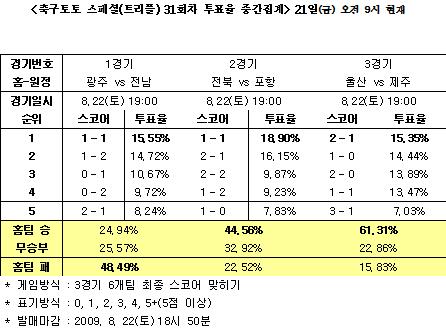 [축구토토] 스포츠토토 공식 온라인 발매 사이트인 베트맨(www.betman.co.kr)는 오는 주말 열리는 K-리그 3경기를 대상으로 하는 축구토토 스페셜 31회차 투표율 중간집계 결과 광주-전남전에서 축구팬 48.49%가 원정팀 전남의 승리를 예상했다고 밝혔다. 반면 홈팀 광주의 승리 예상은 24.94%에 그쳤으며 두 팀의 무승부에는 48.49%의 축구팬들이 투표했다. 특히 이번 광주-전남전은 전반기 1위에 오르며 돌풍을 일으켰던 광주가 최근 5연패에 빠지며 부진을 면치 못하고 있는 가운데 전남을 맞아 연패를 끊을 수 있을지 아니면 전남이 광주를 잡고 중위권 싸움에 힘을 보탤 수 있을 지가 관전 포인트가 될 전망이다. 전북-포항전의 경우는 전북의 승리 예상이 44.56%, 포항 승리 22.52%, 무승부 32.92%의 투표율을 보였다. 최종 스코어별 투표율의 경우 1-1 무승부 18.90%, 2-1 전북 승리 16.15%, 2-2 무승부 9.87%로 나타났다. 울산-제주전에서는 울산 승리 61.31%, 제주 승리 15.83%, 무승부 22.86%로 울산의 승리 예상이 높았다. 최종 스코어별 투표율은 2-1 울산 승리 15.35%, 1-0 울산 승리 14.44%, 2-0 울산 승리 13.89%였다. 한편, 이번 축구토토 스페셜 31회차 게임은 22일(토) 오후 6시 50분에 발매 마감된다. '즐거운 스포츠, 즐거운 토토'(http://www.betman.co.kr)