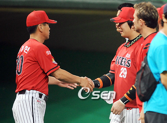 '2009 CJ 마구마구 프로야구' SK 와이번스와 KIA 타이거즈의 3위와 1위 간의 경기가 21일 오후 인천 문학경기장에서 벌어졌다. KIA는 4-4으로 맞서던 8회초 대타 나지완의 만루홈런에 힘입어 8-4 승리, SK전 4연승을 이어갔다. KIA 조범현 감독이 만루 홈런 날린 나지완과 악수를 하고 있다./인천=윤민호 기자ymh@osen.co.kr