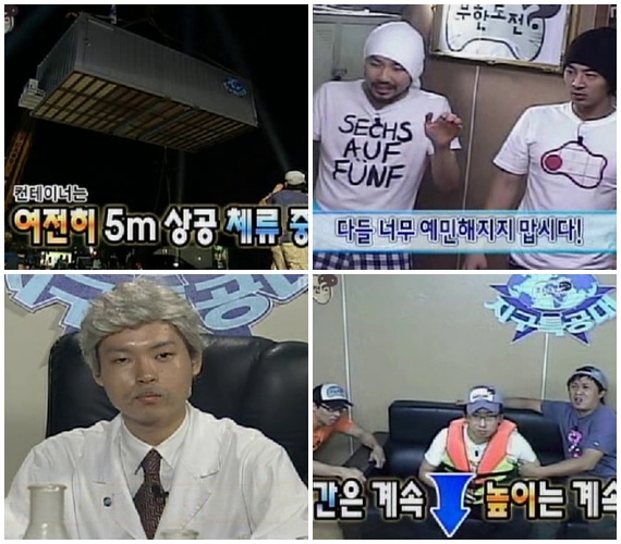 '무한도전' 멤버들이 컨테이너에 갇혀 문제를 푸는 이색 '패닉룸 특집'을 꾸몄다. 22일 방송된 MBC 예능프로그램 '무한도전'에서는 2009 서바이벌 동거동락 특집의 최종회인 '무한도전 패닉룸'이 방송됐다. 새벽 2시, '지구특공대'라는 낯익은 문구 하나가 달린 컨테이너 안에 유재석, 박명수, 정준하, 노홍철, 정형돈, 전진, 길 등 멤버들이 모였다. 컨테이너 문은 잠겨 안에서 열리지 않았고, 멤버들에게는 불안함이 엄습했다. 이렇게 멤버들은 아무런 예고 없이 '패닉룸' 특집에 임하게 됐다. 특수설계된 컨테이너는 안에서 절대 열 수 없었고, 멤버들은 각 문제당 2분 안에 총명함을 요하는 총 9개의 문제를 풀어야 했다. 그 동안 컨테이너는 1분마다 상승했고, 최대 45m까지 공중으로 부양한다는 소리를 들은 멤버들은 경악을 감추지 못했다. 멤버들은 컨테이너 안에서 밖의 영상을 모니터로 볼 수 있어 더욱 공포감을 느꼈다. 사람이 가장 공포감을 느낀다는 11m에 올라가자 멤버들은 아찔함에 어지러움을 호소하기도 했다. 이 와중 길은 자신이 나이트를 자주 찾는다는 발언이 나오자, 연인인 가수 박정아와의 사랑을 지키기 위해 문을 열려고 하는 등 공격적인 모습을 보였다. 그러자 흥분 억제 프로그램인 명상의 시간 '코드 블루'가 작동돼 웃음을 안겼다. 하지만 반전이 등장했다. 컨테이너는 계속 1m 높이에 머무는 것이었고, 멤버들이 보는 영상은 3시간 전에 이미 찍어놓은 가짜 시선컷이었다. 땅에 떨어지는 사람을 위한 매트가 깔리는 것은 보자 정준하는 "(제작진을 향해)쟤네 미쳤나봐"란 탄식을 내뱉었다. 결국 상황을 파악한 멤버들은 기쁨과 황당함이 뒤섞인 반응을 내비치며 안도감에 행복해했다. 사람의 심리를 이용한 신선한 몰래카메라가 특별한 재미를 선사한 방송이었다. 한편 지난 주에 이은 무인도에서 벌어진 열 다섯 남자의 숨막히는 생존 경쟁 서바이벌에서는 이성진과 손호영이 결승까지 진출하게 됐고, 총 10표를 얻은 손호영이 최종 우승의 영광을 안았다. nyc@osen.co.kr