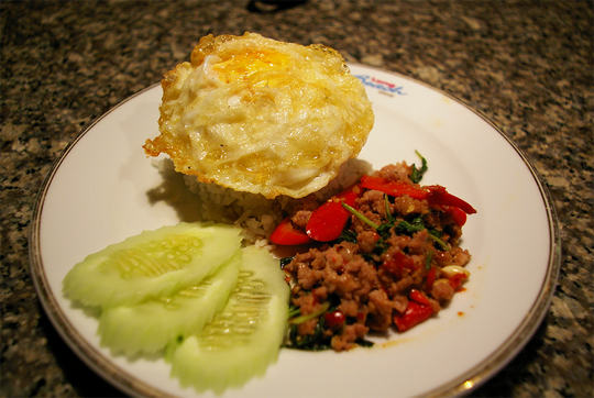 팟 카파오 무쌉은 쌀국수만큼이나 태국인들이 즐겨먹는 일품음식으로 태국식 돼지고기 덮밥을 의미한다. 주로 다진 돼지고기와 채소에 바질과 매운 고추를 넣어 매콤하게 볶는데, 돼지고기 대신 닭고기나 소고기를 사용하기도 한다. 이 음식을 먹을 때 태국 쥐똥고추를 썰어 넣은 생선소스를 뿌려 먹으면 더욱 맛있다. 팟 카파오 무쌉을 만드는 방법은 먼저 잘게 썬 마늘을 금빛 갈색이 될 때까지 센불에서 볶는다. 1/2컵의 바질과 고추를 넣고 살짝 익을때까지 1분간 볶다가 돼지고기를 넣고 3분간 더 볶아준 뒤 생선소스와 물, 야자 설탕을 넣고 볶아준다. 나머지 1/4컵의 바질을 추가로 넣고 5초간 볶아준다. 마지막으로 접시에 담아둔 자스민 쌀밥 위에 계란후라이를 얹고 그 옆에 볶은 돼지고기를 곁들이면 팟 카파오 무쌉이 완성된다. 이 음식은 느끼하지 않아 한국인의 입맛에도 잘 맞으며 닭고기를 넣어 요리할 경우 ‘팟 까파우 까이쌉’이라고도 불린다. 글=여행미디어 취재협조=태국관광청 02-779-5416