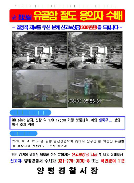 故 최진실 유골함 도난사건을 수사중인 경찰이 유골함 절도용의자를 신고보상금 300만원에 공개수배했으며 여기 갑산공원 측이 3000만원을 추가했다. 경기도 양평경찰서측은 24일 수사 중간 브리핑에서 용의자가 최진실의 납골묘를 사전 답사한 장면이 담긴 CCTV 화면을 추가로 공개하며 “동영상 장면공개와 함께 유골함 사진을 배포하고 공개 수배에 나선다”고 밝혔다. 경찰은 “용의자가 범행 사흘 전인 지난 1일 오후 8시께부터 다음날 오전 6시까지, 10시간 가량 납골묘 주변을 맴돈 것을 확인했다”며 “공개 동영상 장면은 2일 오전 5시 13분 15초부터 약 5분 30초간 용의자가 묘역에 들어와서 하는 행동이다. 시간이 동츨 무렵이라 더 확실하게 식별할 수 있어 공개했다”고 설명했다. 공개된 동영상에서 용의자는 묘 바닥에 앉아 무언가를 문지르는 듯한 모습을 보이기도 하고 허공에 대고 무언가를 휘저었다. 또 지팡이를 들고 서성이거나 메모를 작성하는 등 기이한 행동을 보여 무속의식과 연관성을 염두에 뒀으나 “문의 결과 그런 것 같지는 않다”고 밝혔다. 또 경찰은 “유골함은 아이보리 색에 무게는 2.5kg, 지름 22cm, 높이 20cm, 재질은 자개다. 용의자 검거에 결정적 제보를 해주시는 분게 신고보상금 200만원을 책정해 공개수배를 결정했다”고 설명했다. 갑산공원 묘원측 역시 “유골이 도단당한 것에 대해 송구스럽게 생각한다. 하루 빨리 범인을 잡기 위해 재단 측에서 300만원을 출원하게 됐다”고 밝혔다. 한편 경찰은 용의자 신원과 행적을 추적하기 위해 경기경찰청 광역수사대와 양평경찰서 수사관 등 31명으로 전담밤을 꾸리는 등 수사 인력을 증원 배치했다. miru@osen.co.kr 양평경찰서 제공