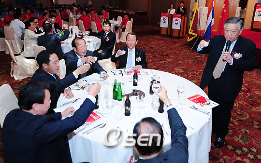 제 8회 아시아청소년야구선수권대회 리셉션이 24일 저녁 서울 마포 가든호텔 무궁화홀에서 열렸다. 이번 대회는 25일부터 29일까지 닷새간 서울 목동야구장에서 열리며 6개국이 상·하위 그룹으로 나눠 리그를 벌인 뒤 우승팀을 가리게 된다. 상위 그룹 A조에는 한국 일본 대만이, 하위 그룹 B조에는 중국 태국 스리랑카가 속해 있다. 2년마다 열리는 이 대회에서 2005년과 2007년 2번 연속 준우승에 그친 한국은 2003년 태국 대회 이후 6년 만에 우승에 도전한다. 리셉션 중 아시아야구연맹 민경훈 사무총장이 건배제의를 하고 있다./민경훈 기자 rumi@osen.co.kr