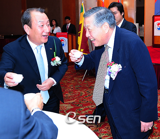 제 8회 아시아청소년야구선수권대회 리셉션이 24일 저녁 서울 마포 가든호텔 무궁화홀에서 열렸다. 이번 대회는 25일부터 29일까지 닷새간 서울 목동야구장에서 열리며 6개국이 상·하위 그룹으로 나눠 리그를 벌인 뒤 우승팀을 가리게 된다. 상위 그룹 A조에는 한국 일본 대만이, 하위 그룹 B조에는 중국 태국 스리랑카가 속해 있다. 2년마다 열리는 이 대회에서 2005년과 2007년 2번 연속 준우승에 그친 한국은 2003년 태국 대회 이후 6년 만에 우승에 도전한다. 리셉션 중 유영구 한국 야구위원회 총재와 민경훈 아시아야구연맹 사무총장이 환하게 웃으며 건배를 하고 있다./민경훈 기자 rumi@osen.co.kr