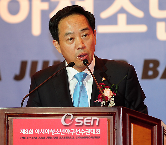 제 8회 아시아청소년야구선수권대회 리셉션이 24일 저녁 서울 마포 가든호텔 무궁화홀에서 열렸다. 이번 대회는 25일부터 29일까지 닷새간 서울 목동야구장에서 열리며 6개국이 상·하위 그룹으로 나눠 리그를 벌인 뒤 우승팀을 가리게 된다. 상위 그룹 A조에는 한국 일본 대만이, 하위 그룹 B조에는 중국 태국 스리랑카가 속해 있다. 2년마다 열리는 이 대회에서 2005년과 2007년 2번 연속 준우승에 그친 한국은 2003년 태국 대회 이후 6년 만에 우승에 도전한다. 강승규 대한야구협회 회장이 대회사를 말하고 있다./민경훈 기자 rumi@osen.co.kr