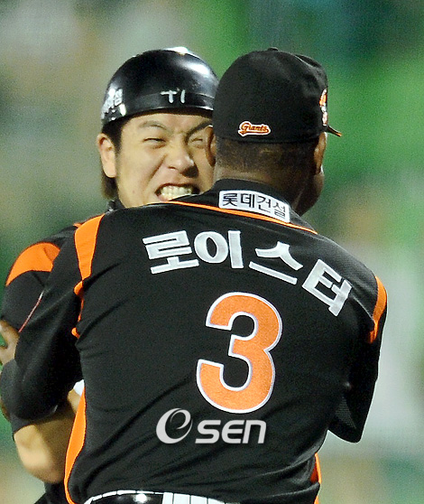 '2009 CJ 마구마구 프로야구' 삼성 라이온즈와 롯데 자이언츠 경기가 25일 대구 경기장에서 열려 롯데가 선발 송승준의 호투와 가르시아의 스리런홈런을 포함 장단 10안타를 터트리며 7-5 승리를 거두었다. 경기 종료후 강민호가 로이스터 감독과 승리의 기쁨을 나누며 익살스러운 표정을 지어보이고 있다./대구=김영민 기자ajyoung@osen.co.kr