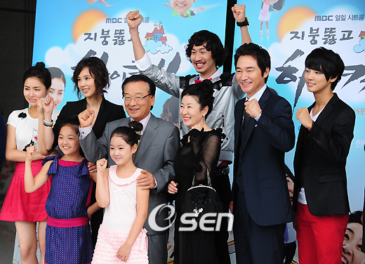 MBC 새 일일 시트콤 '지붕뚫고 하이킥'의 제작보고회가 26일 MBC 일산 드림센터에서 주연배우 이순재 김자옥 오현경 정보석 신세경 등이 참석한 가운데 열렸다. '지붕뚫고 하이킥'은 서울로 갓 상경한 두 자매가 성북동 순재네 집 식모로 입주하게 되면서 이 집 식구들과 벌이는 유쾌한 코미디를 담은 성장 시트콤 드라마다. 출연자들이 파이팅을 외치고 있다./일산=손용호 기자spjj@osen.co.ke