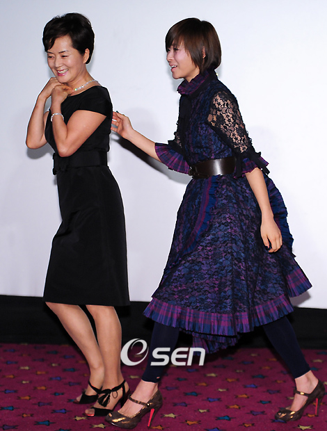 최강희 김영애 주연의 영화 '애자'(시리우스 픽쳐스 제작, 정기훈 각본 감독, 내달 10일 개봉 예정)의 언론시사회가 26일 오후 서울 용산CGV에서 열렸다. 이 영화는 다 큰 처녀의 파란만장한 성장 이야기를 다룬 영화로 방송국 작가 생활을 그만두고 소설가를 꿈꾸는 서른 살의 애자(최강희 분)가 죽음을 앞둔 엄마(김영애 분)와 사사건건 대립하면서 겪는 성장통을 그렸다. 김영애와 최강희가 무대인사를 마친 후 다정하게 퇴장하고 있다./민경훈기자 rumi@osen.co.kr
