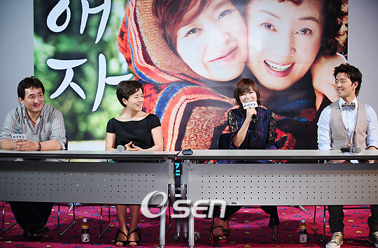최강희 김영애 주연의 영화 '애자'(시리우스 픽쳐스 제작, 정기훈 각본 감독, 내달 10일 개봉 예정)의 언론시사회가 26일 오후 서울 용산CGV에서 열렸다. 이 영화는 다 큰 처녀의 파란만장한 성장 이야기를 다룬 영화로 방송국 작가 생활을 그만두고 소설가를 꿈꾸는 서른 살의 애자(최강희 분)가 죽음을 앞둔 엄마(김영애 분)와 사사건건 대립하면서 겪는 성장통을 그렸다. 기자회견중 최강희의 말에 모두가 환하게 미소짓고 있다./민경훈기자 rumi@osen.co.kr