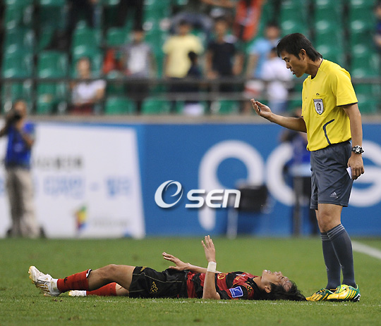 K-리그 피스컵 코리아 2009 4강 2차전 포항 스틸러스와 FC 서울 경기가 26일 저녁 포항 스틸야드 경기장에서 열려 포항이 5-2로 승리, 1차전 합계 6-4로 결승 진출권을 따냈다. 후반 추가시간 포항 노병준이 프리킥을 성공시켜 해트트릭를 달성한 뒤 환호하다 근육 경련으로 그라운드에 넘어져 있자 최광보 대기심이 다가가 일어설 것을 요구하고 있다./포항=김영민 기자ajyoung@osen.co.kr