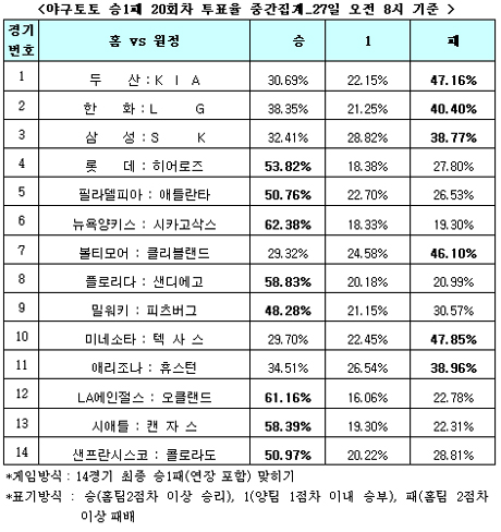 [야구토토] 야구토토 승1패 20회차 투표율 중간 집계 결과…KIA, 두산에 우세 전망 미국프로야구 박찬호 속한 필라델피아 승리 예상…28일 오후 6시 20분 발매마감 국내 야구팬들은 국내프로야구 두산 베어스-KIA 타이거즈전에서 KIA의 우세를 전망했다. 스포츠토토 온라인 발매사이트인 베트맨(www.betman.co.kr)은 오는 28일부터 29일(이하 한국시간)까지 벌어지는 국내프로야구 4경기, 미국프로야구(MLB) 10경기 등 총 14경기를 대상으로 한 야구토토 승1패 20회차 투표율 중간집계 결과 전체 참가자의 절반에 가까운 47.16%가 KIA가 두산에 우세한 경기를 펼칠 것으로 전망했다고 밝혔다. 두산의 승리에 투표한 참가자는 30.69%에 머물렀고, 나머지 22.15%는 양팀의 1점차 박빙승부를 전망했다. 이밖에 국내 프로야구에서는 LG(40.40%)와 SK(38.77%), 롯데(53.82%)가 각각 한화(38.35%), 삼성(32.41%), 히어로즈(27.80%)를 상대로 우세한 경기를 펼칠 것이라는 예상이 다수를 차지했다. ▲MLB, 박찬호 속한 필라델피아 승리 거둘 것 MLB에서는 박찬호가 불펜에서 맹활약하고 있는 필라델피아(50.76%)가 애틀랜타(26.53%)를 누르고 강팀의 면모를 발휘할 것으로 내다봤다. 홈경기를 치르는 플로리다(58.83%)와 밀워키(48.28%), 샌프란시스코(50.97%)는 각각 샌디에이고(20.99%), 피츠버그(30.57%), 콜로라도(28.81%)를 누르고 승수를 올릴 것으로 예상했다. 반면 11경기 애리조나-휴스턴전에서는 원정팀인 휴스턴(38.96%)이 근소한 차이로 홈팀 애리조나(34.51%)를 물리칠 것으로 전망했다. 아메리칸리그에서는 팀의 중심타자로 활약하고 있는 추신수의 클리블랜드(46.10%)가 볼티모어(29.32%)에 우세한 경기를 펼칠 것으로 예상했다. 이밖에 뉴욕 양키스(62.38%)를 비롯해 텍사스(47.85%), LA 에인절스(61.16%), 시애틀(58.39%) 등 상위권을 유지하고 있는 전통의 강호들이 승리를 거둘 것으로 예상한 참가자가 많았다. 한편 이번 야구토토 승1패 20회차 게임은 첫번째 경기 시작 10분전인 28일 오후 6시 20분에 발매를 마감하며 모든 경기가 종료된 후 결과를 공식 발표한다. '즐거운 스포츠, 즐거운 토토'(http://www.betman.co.kr)