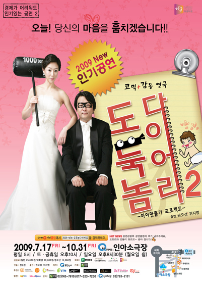 2008년 조그만 소극장에서 관객들을 웃고 울렸던 연극 가 -아이 만들기 프로젝트-란 타이틀로 대학로 인아소극장에서 늦더위를 잊게끔 하는 관객몰이를 하고 있다. 흔치 않은 공연시간대인 평일오후 5시, 토요일 10시공연, 일요일 8시30분, 공연인 은 평일에는 주부들의 선호시간인 5시공연이, 토요일은 심야 테이트를 공연과 함께 하려는 연인들로 조금씩 조금씩 입소문이 나고 있다. 관객들이 선호하는 연극은 어떤 것일까? 그 무슨 이유가 있을까? 요즘 관객들은 무조건 웃기기만 연극만을 고집할까? 그 해답을 감동과 웃음이 함께 묻어 나는 연극인 에서 찾을수 있다. 전작처럼 좀처럼 잡기 힘든 코믹과 감동으로 시종일관 관객들의 시선을 끌고 다닌다. 1시간 10분 비교적 잛은 공연이지만 2명의 배우가 이만한 집중력을 보여주는 공연을 찾기란 쉽지 않다. 작은 소극장 이라기 보다는 중극장 규모의 극장인 인아소극장은 넓은 무대와 편한객석이 우선 소극장의 답답함을 사라지게 만든다. 시작부터가 예사롭지 않다. 주인공인 두칠이 관객들과 인사하면서 간단한 게임으로 관객들의 기분을 업시킨다. 단촐하지만 두칠과 동나의 결혼사진과 소파 작은 침대..아기자기한 소품들은 이제 갓 결혼한 신혼부부의 집을 몰래들여다 보고 있는 느낌이 든다. 여느 신혼 부부와는 다른 두칠과 동나의 알콩달통 티격태격 신혼 다이어리!! 고아로 자란 도둑놈 두칠이와 어린 시절 아픈 기억을 지닌 꽃뱀 동나. 두칠의 진심을 확인하고 개과천선하여 결혼을 하게 되는데 일자무식 백수 두칠과 아이갖기를 피하는 동나에게 예상치 못한 사건이 발생한다. 둘 사이의 웃지못할 사건과 가슴 짜릿한 이야기들을 지루하지 않게 연출자 특유의 코믹 요소를 곳곳에 뿌려 시종일관 관객들의 웃음을 자아 낸다. 동나의 독백중 "살기 힘들다고 돈 조금 더 모아야 한다고.......가장 소중한 사람의 마음을 아프게 한것 같아요." 웬지 가슴이 찡해 오면서 진정한 관심과 사랑이 무엇인지??를 깨달게 해준다. 전작을 관람한 관객이라면 기대치를 높이 품어도 되지 않을까? 일상적인 단면에서 느낄수 있는 따듯한 정서가 그래도 곳곳에 숨어 있어서 관객들을 웃고 울리게 하는것은 극찬 하고 싶다. 아쉬움이 있다면 겉으로 멀쩡해 보이지만 저마다 상처를 안고 살아가고 있는게 요즘 인간들의 군상 아닌가? 다소 작위적인 희망에 대한 의지는 약간은 김을 빠지게도 한다. 아무려면 어떤가? 관객들에 찡한 감동을 줄수 있는 몆 안되는 수작이다. 지치고 힘든 여름 소중한 사람과 함께 웃음과 감동에 빠져 보자. 특히 결혼을 결심하려고하는 연인들에게 적극 추천하고 싶다. 신혼생활에 대한 예비경험 차원에서...신혼의 단맛을 향수 하고 싶은 주부들에게는 더욱 강력히 추천한다. ▶공연명: 도둑놈 다이어리2 ▶공연일정: 2009.7.17~10.31 ▶공연시간: 평일5시 / 토요일,공휴일 오후10시 / 일요일 8시30분 ▶공연장소: 대학로 인아소극장 ▶출연배우: 위지영/ 장도현 ▶문의 : 02-745-7610 [OSEN=생활경제팀]osenlife@osen.co.kr