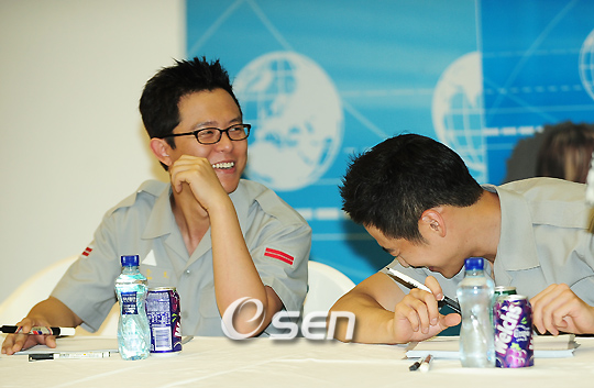 ITC2009 인천국제정보산업전시회 국군방송이 함께하는 홍보지원대 팬사인회 행사가 28일 오후 인천 연수구 송도동 컨벤시아 전시장 이벤트 홀에서 열렸다. 이 자리에는 연예병사 토니안, 양동근, 김재원, 재희, 온주완이 참석했다. 이들은 국방홍보원 홍보지원대의 연예병사들로 국군방송 FM의 위문열차 등에서 활약을 하고 있다. 사인회에서 토니안과 김재원이 즐겁게 웃고 있다./연수(인천)=민경훈 기자 rumi@osen.co.kr