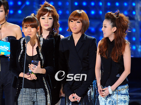 대한민국에서 유일한 여름 시상식인 '제3회 Mnet 20’s Choice'(엠넷 초이스)가 28일 오후 서울 잠실 실내체육관에서 열렸다. 올해로 3회째를 맞는 '엠넷 20's 초이스'는 20대를 위한, 20대에 의한 시상식이라는 모토 아래 음악·영화˙드라마·스포츠 등 대중문화 전반에 걸쳐 '핫한' 아이콘을 뽑는 행사이며 레드 카펫 대신 블루 카펫을, 그리고 야외 수영장과 화끈한 드레스 코드, 대형 공연 퍼포먼스 등을 진행하는 '신개념' 여름 시상식이다. 핫 뉴 스타상을 수상한 2NE1이 수상 소감을 전하고 있다./윤민호 기자ymh@osen.co.kr