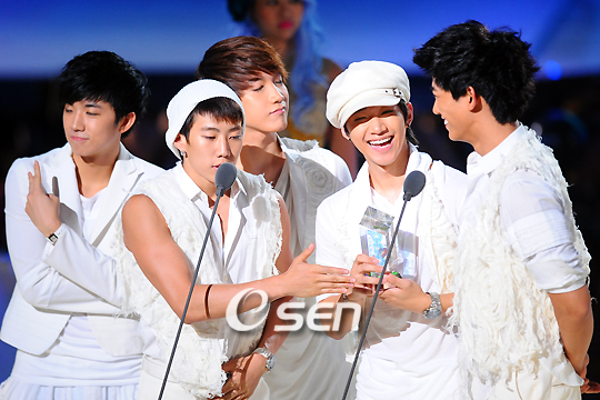대한민국에서 유일한 여름 시상식인 '제3회 Mnet 20’s Choice'(엠넷 초이스)가 28일 오후 서울 잠실 실내체육관에서 열렸다. 올해로 3회째를 맞는 '엠넷 20's 초이스'는 20대를 위한, 20대에 의한 시상식이라는 모토 아래 음악·영화˙드라마·스포츠 등 대중문화 전반에 걸쳐 '핫한' 아이콘을 뽑는 행사이며 레드 카펫 대신 블루 카펫을, 그리고 야외 수영장과 화끈한 드레스 코드, 대형 공연 퍼포먼스 등을 진행하는 '신개념' 여름 시상식이다. 2PM이 핫 퍼포먼스 스타상을 받고 있다./윤민호 기자ymh@osen.co.kr