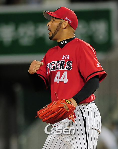 '2009 CJ 마구마구 프로야구' 두산 베어스와 KIA 타이거즈의 경기가 29일 서울 잠실 구장에서 벌어졌다. 이 날 경기에서 KIA는 1회 좌월 투런으로 2경기 연속 홈런을 때려내며 역대 월간 최다 홈런(15개)-최다 타점(38타점) 타이기록을 세운 김상현과 9이닝 2실점으로 2번째 완투승을 거둔 선발 아킬리노 로페즈를 앞세워 두산에게 8-2로 승리했다. 경기를 마치고 KIA 로페즈가 주먹을 불끈쥐며 환호하고 있다./잠실=민경훈 기자 rumi@osen.co.kr