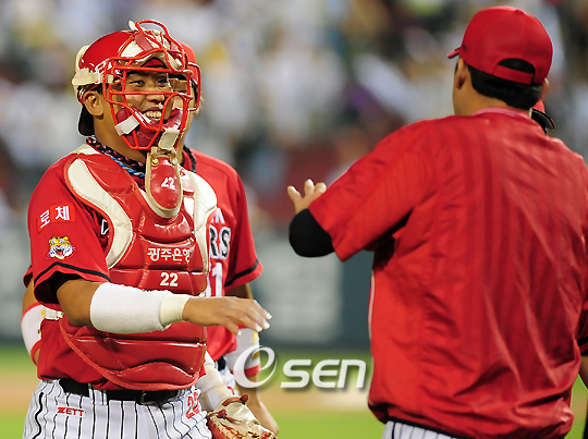'2009 CJ 마구마구 프로야구' 두산 베어스와 KIA 타이거즈의 경기가 29일 서울 잠실 구장에서 벌어졌다. 이 날 경기에서 KIA는 1회 좌월 투런으로 2경기 연속 홈런을 때려내며 역대 월간 최다 홈런(15개)-최다 타점(38타점) 타이기록을 세운 김상현과 9이닝 2실점으로 2번째 완투승을 거둔 선발 아킬리노 로페즈를 앞세워 두산에게 8-2로 승리했다. 경기를 마치고 KIA 김상훈과 서재응이 기쁨을 나누고 있다./잠실=민경훈 기자 rumi@osen.co.kr