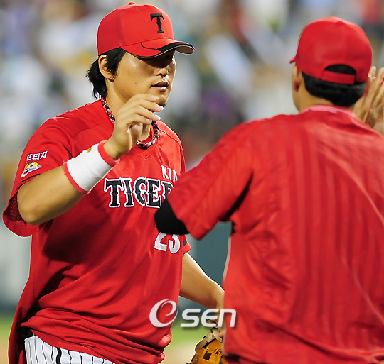 '2009 CJ 마구마구 프로야구' 두산 베어스와 KIA 타이거즈의 경기가 29일 서울 잠실 구장에서 벌어졌다. 이 날 경기에서 KIA는 1회 좌월 투런으로 2경기 연속 홈런을 때려내며 역대 월간 최다 홈런(15개)-최다 타점(38타점) 타이기록을 세운 김상현과 9이닝 2실점으로 2번째 완투승을 거둔 선발 아킬리노 로페즈를 앞세워 두산에게 8-2로 승리했다. 경기를 마치고 KIA 최희섭과 서재응이 기쁨을 나누고 있다./잠실=민경훈 기자 rumi@osen.co.kr