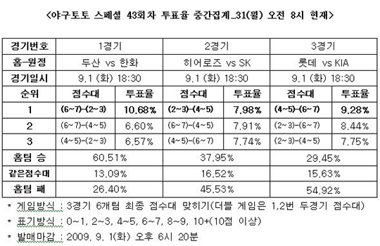 [야구토토] 국내 야구팬들은 오는 1일 오후에 벌어지는 2009시즌 국내프로야구 두산-한화전에서 두산의 승리를 전망했다. 스포츠토토 공식 온라인 발매 사이트인 베트맨(www.betman.co.kr)은 오는 1일 오후에 펼쳐지는 두산-한화, 히어로즈-SK, 롯데-KIA전 등 국내 프로야구 3경기를 대상으로 한 야구토토 스페셜 43회차 투표율 중간집계 결과 전체 참가자의 60.51%가 두산의 승리 가능성을 높게 점쳤다고 밝혔다. 26.40%는 원정팀 한화의 승리를 내다봤고, 나머지 13.09%는 양팀이 같은 점수대를 기록할 것으로 예상했다. 최종 점수대로는 6~7점-2~3점으로 두산 승리(10.68%)가 가장 많았고, 6~7점-4~5점 두산 승리(6.50%), 4~5점-2~3점 두산 승리(6.57%)가 뒤를 이었다. 히어로즈-SK전은 참가자의 45.53%가 SK의 승리를 예상했고, 37.95%는 홈팀 히어로즈의 우세에 투표했다. 같은 점수대를 예상한 참가자는 13.09%로 나타났다. 최종 점수대로는 2~3점-4~5점으로 SK 승리(7.98%)가 최다를 차지했고, 6~7점-4~5점 히어로즈 승리(7.91%), 4~5점-6~7점 SK 승리(7.74%) 순으로 집계됐다. 롯데-KIA전은 54.92%가 KIA의 승리를 전망했고, 29.45% 롯데의 승리를 예상하는 것으로 나타났다. 나머지 15.63%는 같은 점수대를 기록할 것으로 내다봤다. 최종 점수대에서는 4~5점-6~7점 KIA 승리가 9.28%로 1순위를 차지했고, 2~3점-6~7점 KIA 승리(8.44%), 2~3점-4~5점 KIA 승리(7.75%) 순이었다. 한편 이번 야구토토 스페셜 34회차 게임은 첫번째 경기시작 10분 전인 1일 오후 6시 20분에 발매가 마감된다. '즐거운 스포츠, 즐거운 토토'(http://www.betman.co.kr)