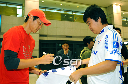 코 부상에도 불구하고 출전의지를 불태우는 김남일(빗셀 고베)이 상암월드컵경기장에서 열리는 호주와의 국가대표팀 평가전(5일)을 위해 31일 오후 인천국제공항을 통해 입국했다. 해외파 선수들은 1일 파주 국가대표트레이닝센터(NFC)에 소집돼 컨디션을 조절하고, 3일 K-리거들이 대표팀에 합류하면 본격적인 호주전 담금질에 들어갈 예정이다. 김남일이 팬에게 사인을 해주고 있다./인천공항=윤민호 기자ymh@osen.co.kr