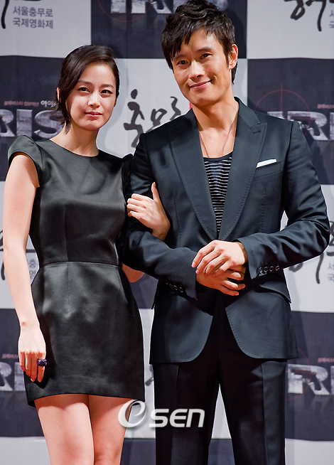 이병헌 김태희 정준호 김승우 김소연 최승현(T.O.P) 등 국내 정상급 스타들이 출연해 큰 화제를 모으고 있는 KBS 새 드라마 '아이리스(김현준 극본, 김규태 양윤호 연출)'의 쇼케이스가 제3회 서울충무로국제영화제 특별이벤트로 31일 저녁 서울 광화문 청계광장에서 열렸다. 첩보원들의 액션과 배신, 로맨스를 그린 이 드라마는 200억여 원에 달하는 제작비와 아시아와 유럽을 넘나드는 해외 로케이션 등으로 화려한 볼거리를 예고하고 있으며 내달 14일 첫 방송 예정이다. 김태희와 이병헌이 무대 위에서 포토타임을 갖고 있다./민경훈 기자 rumi@osen.co.kr
