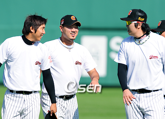 '2009 CJ 마구마구 프로야구' 롯데 자이언츠와 KIA 타이거즈의 올 시즌 마지막 맞대결 경기가 1일 오후 부산 사직구장에서 벌어진다. KIA 김상현(31개)과 최희섭(25개)은 홈런 부문 1·3위, 롯데 이대호(26개)와 가르시아(24개)는 부문 2·5위에 올라 있어 홈런 맞대결이 기대되는 경기이다. 경기 전 롯데 조정훈-송승준-장원준이 즐거운 대화를 나누고 있다./부산=윤민호 기자ymh@osen.co.kr