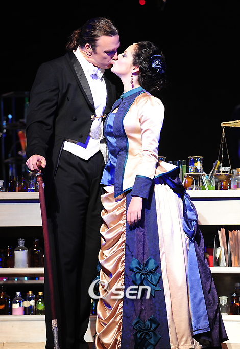 소설과 영화로 우리에게 낯익은 프랭크 와일드혼 원작의 '지킬앤 하이드'의 쇼케이스가 주연배우 브래드 리틀(지킬앤하이드), 루시 몬더(엠마) 등 출연진이 참석한 가운데 1일 세종문화회관에서 열렸다. 세계 정상급 뮤지컬 배우 브래드 리틀이 주인공으로 나와 기존 라이선스 공연에서 볼 수 없었던 새로운 버전의 공연을 취재진에게 하이라이트로 보여줬다. 벨린다 월스톤(루시)은 몸이 좋지 않아 참석하지 못했다. 지킬앤 하이드 역의 브래드 리틀과 루시 몬더가 뜨거운 키스신을 연출하고 있다./손용호 기자spjj@osen.co.kr