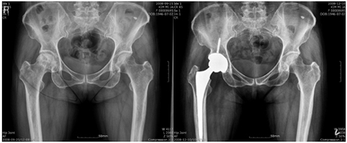 평소 사람들과 어울리기를 좋아해 자연스레 술자리도 잦은 평범한 직장인 강모(47세, 남)씨. 6개월 전부터 왼쪽 사타구니와 엉덩이 쪽으로 통증이 있었다고 한다. 시간이 지나면 낫겠지 하고 기다리다가 통증이 심해져서 찾아간 병원에서 뜻밖에 고관절 무혈성 괴사증이라는 진단을 받았다. 가정주부 권모(54세, 여)씨는 어릴 적부터 왼쪽 다리가 약간 짧고 움직임이 부자연스러웠다고 하는데 생활하는데 큰 불편함이나 통증이 없어서 별다른 걱정을 안 하고 살아왔다고 한다. 하지만 3년 전부터 서서히 통증이 심해졌고, 그녀는 집 가까운 병원에서 비구 이형성증에 의한 이차성 고관절 퇴행성 관절염으로 진단받았다. 두 사람 모두 병세가 심하여 말기라는 얘기를 들었고 결국 인공 고관절 치환술을 해야 한다는 전문의의 권유를 받았다. 아직은 비교적 젊은 축에 속한다고 생각한 그들은 인공 관절 수술을 해야 한다는 사실에 걱정이 앞서 잠시 망설였지만 결국 인공 고관절 치환술을 받았다. 지금은 많이 회복되어 거의 정상에 가까운 일상생활을 할 뿐만 아니라 자전거 타기를 하는데도 전혀 지장이 없을 정도로 관절 기능이 회복되었다. 인공 관절 치환술이 말기 관절염이나 무혈성 괴사증이 있을 경우 최선의 치료법이라는 것은 관심이 있는 사람들은 다 아는 사실이지만 인공 관절 수술을 하면 수명이 있고 또 고관절의 경우에는 탈구가 잘된다는 사실 때문에 수술을 피하게 되는 경우가 많이 있다. 강 모 씨나 권 모 씨처럼 나이가 아주 많지 않은 중년에는 더더욱 그러한 경향이 두드러진다. 인공 관절은 해가 갈수록 디자인이나 재질이 발전하고 있다. 무릎관절과 마찬가지로 고관절의 인공 관절도 나날이 발전하고 있는데 관절 접촉 부분을 세라믹으로 만들기 때문에 마모가 엄청나게 줄어들어 재수술이 필요한 확률을 낮추었으며 인공 관절의 수명도 그만큼 늘어나게 되었다. 세라믹이 인공 관절에 사용된 것은 어제 오늘의 일은 아니지만 과거의 세라믹은 마모는 잘 일어나지 않는 대신 세라믹이 깨지는 경우가 간혹 발생하여 환자와 의사를 곤혹스럽게 하는 경우가 있었기 때문에 사용을 꺼리는 의사들도 있었다. 최근에 개발한 세라믹 인공 관절은 4세대 세라믹을 이용한 것이다. 4세대 세라믹은 강도는 이전 세대보다 비슷하거나 더 강하면서도 잘 깨지지 않는다. 그러기 때문에 걱정 없이 사용할 수 있다. 그것뿐만이 아니다. 잘 깨지지 않기 때문에 인공 관절의 접촉 부분을 더 얇게 만들 수 있다. 이것은 기존에 쓰던 인공 대퇴 골두가 28mm의 지름을 가진 것에 비하여 36mm 정도의 지름으로 훨씬 더 큰 인공 골두를 사용할 수 있게 한다. 대퇴 골두가 커지면 움직임이 훨씬 자연스러우며 관절의 움직이는 범위도 커질 뿐만 아니라, 탈구가 잘 되지 않기 때문에 인공 고관절 수술 후에 관절이 빠지지 않을까 하는 걱정을 하나 덜 수 있다. 4세대 세라믹을 이용한 인공 고관절 수술, 세라믹이 깨지는 확률도 줄어들었고 큰 인공 대퇴 골두를 사용함으로써 관절의 움직임도 좋아지고 탈구도 예방할 수 있다고 하니 인공 관절의 진화는 대체 어디까지일까 지켜보는 것도 재미있는 일이 될 것 같다. 전재훈(연세사랑병원[강북점] 인공관절센터 과장). /OSEN=생활경제팀 osenlife@osen.co.kr 수술 전 후의 비교 사진.