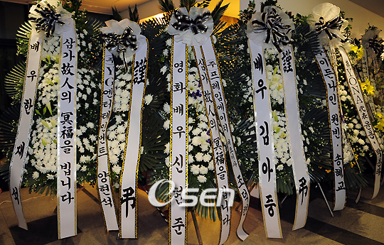 톱스타 장진영이 1일 오후 서울 강남성모병원에서 37세 젊은 나이에 안타깝게 세상을 떠났다. 장진영은 지난해 9월 위암 검진을 받고 투병생활에 들어갔으나 최근 암세포가 몸 전체로 퍼져 의식을 잃을 정도로 상태가 나빠졌다. 장진영의 빈소는 이날 저녁 서울 아산병원에 차려져 뒤늦게 소식을 듣고 조문을 온 동료 연예인들과 팬들의 행렬이 이어졌다. 빈소에 수많은 연예인 동료들의 근조조화가 이어지고 있다./민경훈 기자 rumi@osen.co.kr