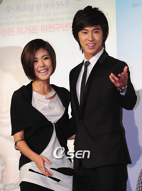 MBC 수,목 미니시리즈 ‘맨땅에 헤딩’의 제작보고회가 2일 주연배우 동방신기의 유노 윤호, 아라, 이상윤, 이윤지 등이 참석한 가운데 하얏트 호텔에서 열렸다. 젊은 축구 선수와 스포츠 신문 기자 출신의 여성 에이전트의 꿈과 사랑을 다룬 드라마다. 유노 윤호가 이윤지 와의 키스신에 대해 '정확히 말해 키스신이 아니고 인공호흡이다.많이 떨렸다'고 밝혔다. 이윤지와 유노 윤호가 포토타임을 갖고 있다./손용호 기자spjj@osen.co.kr