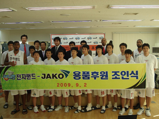 프로농구 인천 전자랜드 엘리펀츠가 '자코 코리아'와 2009~2010시즌 공식 스폰서 계약을 체결했다. 전자랜드는 지난시즌 용품 공식 스폰서와 계약이 종결됨에 따라 차기 시즌 스폰서를 물색하던 중 스포츠마케팅에 관심이 큰 '자코 코리아'와 손을 잡게 됐다. 계약기간은 2시즌이며 후원 금액은 연간 3억 원이다. 1989년 독일에서 설립돼 현재 독일 스포츠 시장 점유율 2위를 차지하고 있는 '자코(JAKO)'는 전통과 신뢰성을 보증하는 브랜드로 현재 잉글랜드 프리미어리그 포츠머스와 유럽 17여 개 국 및 120여 개 클럽을 지원하고 있다. 국내에서는 2006년 2월 법인을 설립해 2006~2007년 N-리그, 2006~2008시즌 창원 LG 세이커스 프로농구단, 2008년 광주 프로축구단을 공식 후원했다. 2009년 2월에는 제3회 '2008 스포츠*레저 용품 브랜드 대상' 크리에이티브 부문서 수상했다. '자코 코리아'와 함께 만든 새 공식 유니폼은 오는 6일 오후 3시 인천 삼산월드체육관에서 개최되는 2009 NBA 아시아챌린지 NBA 연합팀과 친선전에서 첫 선을 보일 예정이다. 2일 오후 삼산월드체육관에서 열린 조인식에 참석한 김민영 자코 부사장은 "전자랜드는 매년 성적이 상승하고 있고 가능성이 높은 구단이라 생각했다. 양사간의 가능성을 믿고 서로 윈윈할 수 있을 것이라고 믿는다"고 소감을 밝혔다. 서장훈과 윤영필이 새 유니폼 착용식을 가졌고 서장훈은 구단을 대표해 '자코 코리아' 측에 농구단 친필 사인공을 전달했다. 10bird@osen.co.kr 전자랜드 제공.
