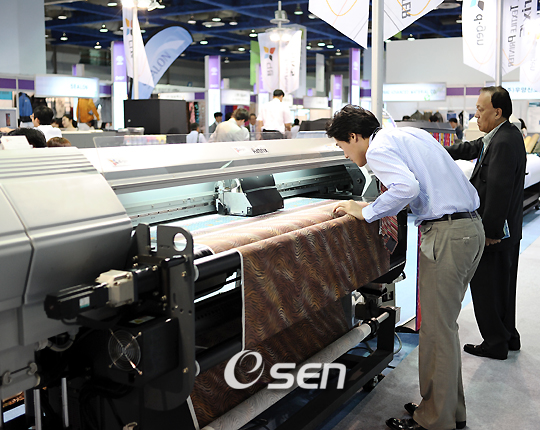 우리나라의 대표적인 섬유소재 전시회인 ‘프리뷰 인 서울 2009’(대한민국섬유교역전)가 2일 오전 개막식을 시작으로 서울 삼성동 코엑스 1층 인도양홀에서 3일간의 행사에 들어갔다. 서울시와 한국섬유산업연합회가 주최하고 지식경제부 대구광역시 KOTRA가 후원하는 이번 행사에는 214개 섬유업체가 418개 부스를 구성해 한국 섬유산업의 오늘과 내일을 점칠 수 있게 했다. 디지털 섬유 프린팅 솔루션 제공 전문업체인 ㈜디젠도 대한민국 섬유교역전에 야심차게 참여 했는데 산업용 디지털 프린터 분야에서 독보적인 기술을 보유하고 있는 디젠은 이번 전시회를 ‘예술적 디자인과 기술적 표현’의 한계를 극복하는 전기로 삼고자 하고 있다. 디젠이 생산하고 있는 디지털 날염 기술은 예술적 범주의 다양한 디자인 작품들을 질적 손실 없이 대량생산이 가능하게 해 핸드메이드 예술 작품의 산업화 과정을 앞당길 수 있을 것으로 기대되고 있다. 디젠의 디지털 날염기들이 전시장내 부스에 비치 돼 제품이 생산되는 과정을 보여주고 있다. /강희수 기자 100c@osen.co.kr