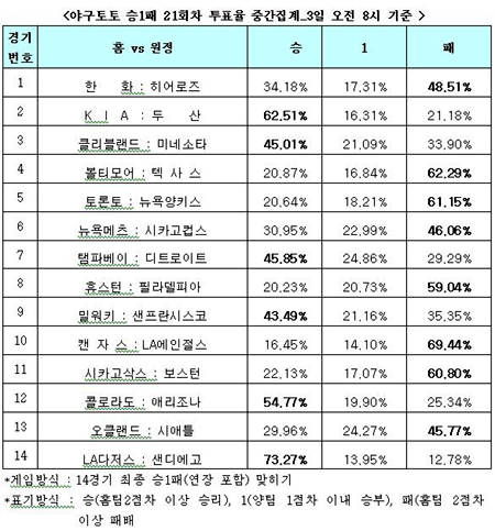 [야구토토] 국내 야구팬들은 미국프로야구 휴스턴-필라델피아전에서 필라델피아의 우세를 전망했다. 스포츠토토 온라인 발매사이트인 베트맨(www.betman.co.kr)은 오는 4일부터 5일(이하 한국시간)까지 벌어지는 국내프로야구 2경기, 미국프로야구 MLB 12경기 등 총 14경기를 대상으로 한 야구토토 승1패 21회차 투표율 중간집계 결과 전체 참가자의 절반이 넘는 59.04%가 박찬호가 활약하고 있는 필라델피아가 휴스턴에 우세한 경기를 펼칠 것으로 전망했다고 밝혔다. 휴스턴의 승리에 투표한 참가자는 20.23%에 머물렀고, 나머지 20.73%는 양팀의 1점차 박빙승부를 전망했다. 또 한명의 코리안메이저리거 추신수가 맹타를 휘두르고 있는 클리블랜드(45.01%)는 미네소타(33.90%)를 물리치고 승수 쌓기에 성공할 것이라는 예상이 많이 집계됐다. ▲아메리칸리그 전통의 강호 뉴욕, 보스턴 나란히 승리 거둘 것 아메리칸리그 전통의 강호 뉴욕 양키스(61.15%)와 보스턴 레드삭스(60.80%)는 각각 토론토(20.64%)와 시카고 화이트삭스(22.13%)를 맞아 완승을 거둘 것으로 전망했다. 이밖에 아메리칸리그에서는 텍사스(62.29%)를 비롯해 탬파베이(45.85%), 시애틀(45.77%) 등이 승리를 챙길 것이라는 예상이 많이 나왔다. 내셔널리그에서는 리그 최고 승률을 자랑하는 LA 다저스(73.27%)가 안방에서 샌디에이고(12.78%)를 맞아 압승을 거둘 것이라는 예상이 지배적이었다. 또 시카고 컵스(46.06%)와 밀워키(43.49%), 콜로라도(54.77%)는 각각 뉴욕 메츠(30.95%)와 샌프란시스코(35.35%), 애리조나(25.34%)에 우세한 경기를 펼칠 것으로 예상했다. ▲국내프로야구 히어로즈, KIA 우세한 경기 펼칠 것 잔여경기가 펼쳐지고 있는 국내 프로야구에서는 한화-히어로즈(1경기)전과 KIA-두산(2경기)에서 각각 히어로즈(48.51%)와 KIA(62.51%)의 우세를 전망한 야구팬들이 많았다. 한편, 이번 야구토토 승1패 21회차 게임은 첫번째 경기 시작 10분전인 4일 오후 6시20분에 발매를 마감하며 모든 경기가 종료된 후 결과를 공식 발표한다. '즐거운 스포츠, 즐거운 토토'(http://www.betman.co.kr)