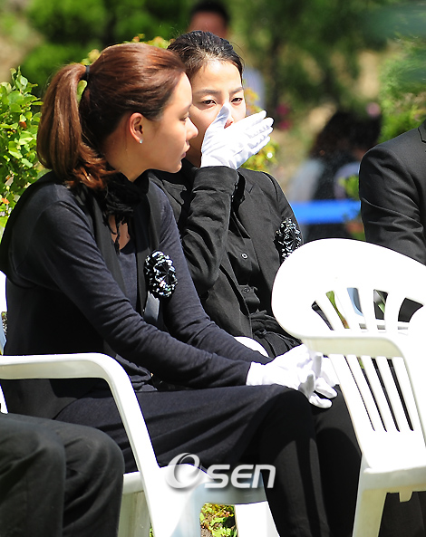 지난 1일 오후 37세의 꽃다운 나이에 세상과 이별한 톱스타 장진영의 장례식이 4일 오후 경기도 광주시 오포읍 신현리 '분당 스카이캐슬 추모공원'에서 엄숙하게 치러졌다. 장진영은 지난해 9월 위암 검진을 받고 투병생활에 들어갔으나 최근 암세포가 몸 전체로 퍼져 의식을 잃을 정도로 상태가 나빠졌다. 그 동안 장진영의 빈소에는 동료 연예인들과 팬들의 조문 행렬이 이어졌다. 추모식 중 김아중과 한지혜가 눈물을 흘리고 있다./광주(경기)=민경훈 기자 rumi@osen.co.kr