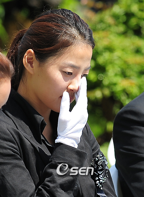 지난 1일 오후 37세의 꽃다운 나이에 세상과 이별한 톱스타 장진영의 장례식이 4일 오후 경기도 광주시 오포읍 신현리 '분당 스카이캐슬 추모공원'에서 엄숙하게 치러졌다. 장진영은 지난해 9월 위암 검진을 받고 투병생활에 들어갔으나 최근 암세포가 몸 전체로 퍼져 의식을 잃을 정도로 상태가 나빠졌다. 그 동안 장진영의 빈소에는 동료 연예인들과 팬들의 조문 행렬이 이어졌다. 추모식 중 한지혜가 눈물을 흘리고 있다./광주(경기)=민경훈 기자 rumi@osen.co.kr
